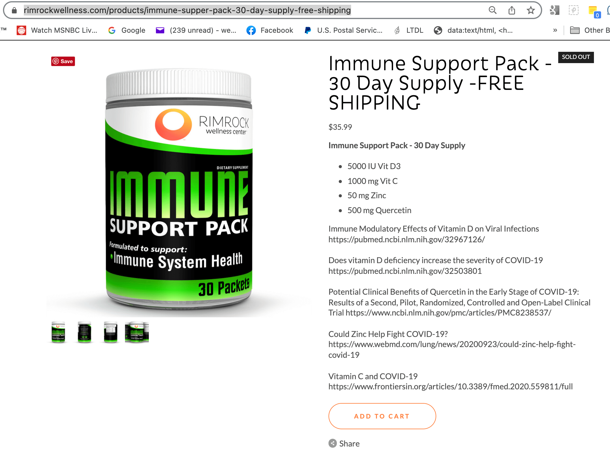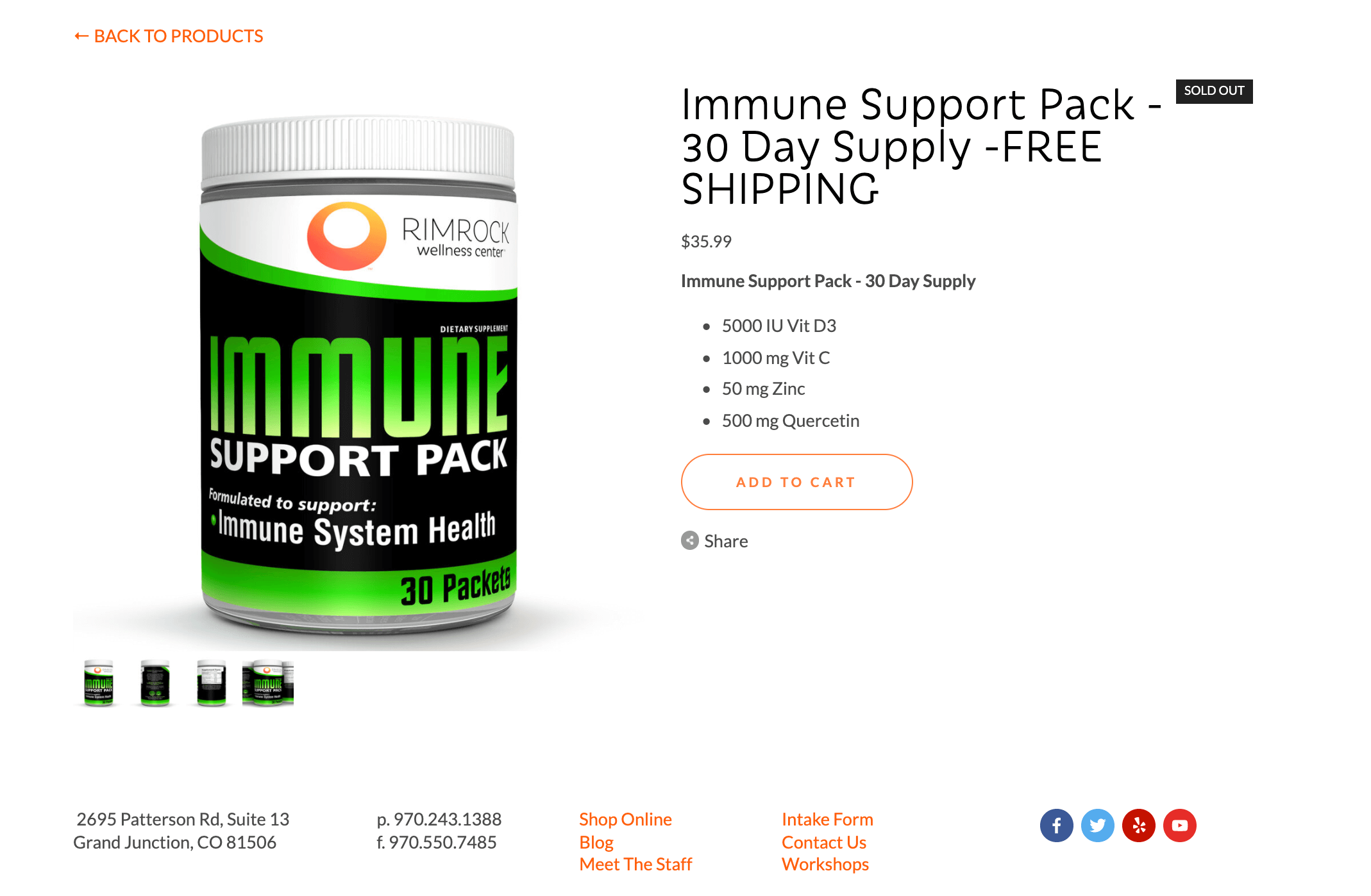 Last month we noticed that Grand Junction chiropractor Greg Haitz of the Rimrock Wellness Center at 12th and Patterson, was marketing his own proprietary “Rimrock Wellness Center” brand of dietary supplement, “Immune Support Pack,” with a description that inferred the product could help mitigate or protect against Covid-19, or “C19”: