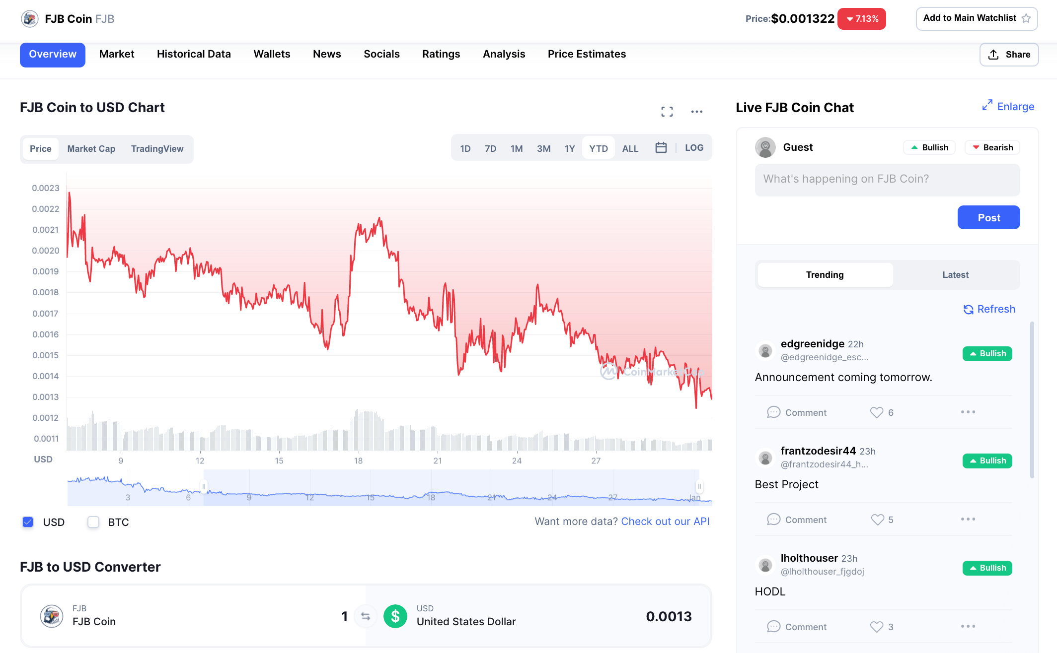 As of this writing, one $FJB coin was worth $0.001322 — about one-one thousandth of one U.S. cent, and it’s down about 10 percent today, too.