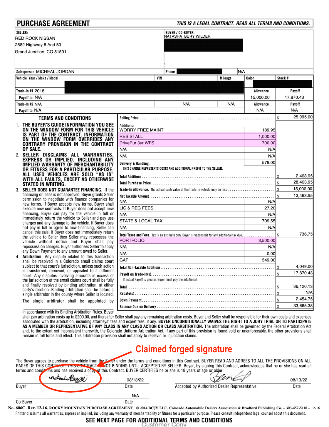 In another case discovered in the last few weeks, Aldahir Ayon of Rifle bought a car from Red Rock Honda on May 20, 2023, and after digging out his documents found an unwanted, multi-thousand dollar extended warranty tacked onto his contract without his knowledge or approval, and found what is also likely a forged signature on his documents :