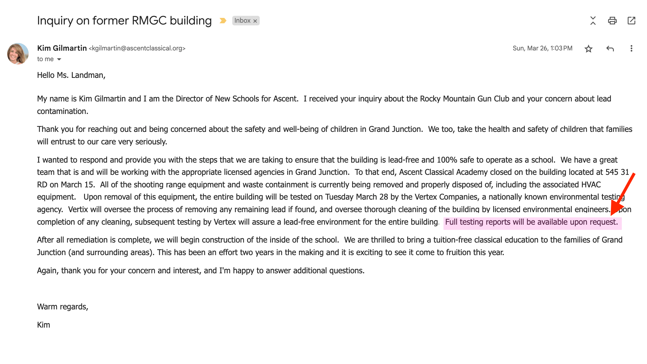 Initially last March, Ascent’s then-Director of New Schools promised that “Full [post-remediation] testing reports will be available upon request.”: