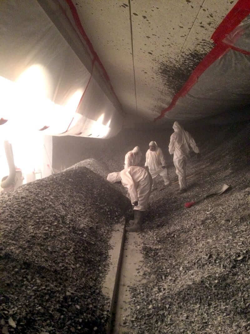 A photo of remediation workers in an indoor shooting range. Shooting ranges are hazardous waste sites that require remediation workers to wear full body protective gear and respirators. (Photo: MT2 Firing Range Services)