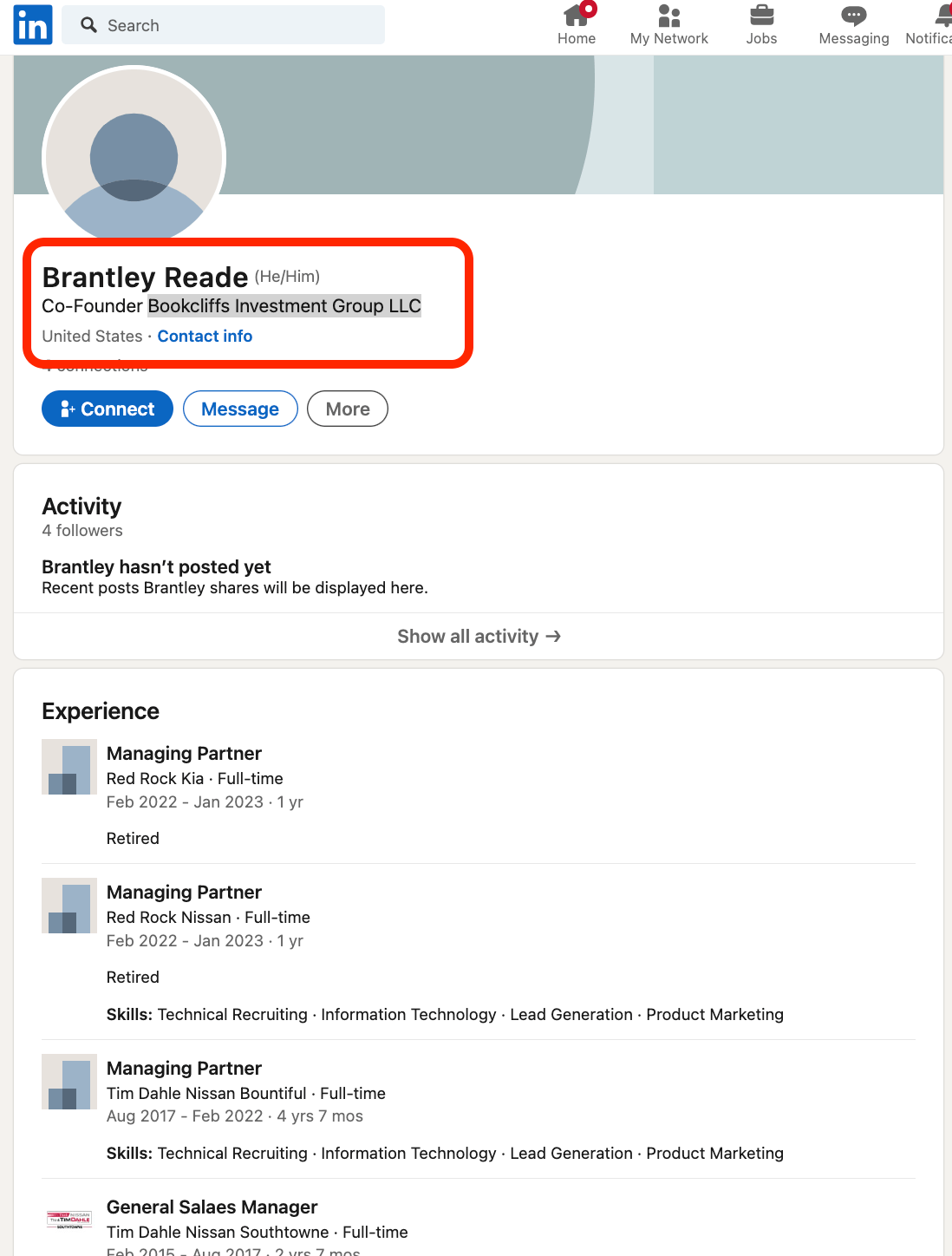 I’m more than happy to talk about my business practices, I’m not part of their business nor do I want to comment about rumors, I wasn’t close enough to the situation to know facts, I have heard rumors and we all know how things can be stretched from the truth. I managed the Nissan dealership from the end of February 2022 until the end of January 2023 when we quit. I won’t be a scapegoat. I was never a principal with this dealership, hence the ability for us to quit and walk away. One of my goals is to write a training program on the right way to treat people, to listen, solve their problems, help them and how to retain a customer for life. The reason I was successful, not what she is trying to paint Brantley and me to be from a source that lacks credibility and has their own agenda. There is a lot of misinformation mixed with what is true, the investigators in the last article debunked a lot of claims that have been made, and from the affidavits there seems to be truth but we will find out because everyone deserves a proper trial before judgement is passed. Like I said I am not a part of that company nor am I a part of a “fraternity” of managers. I’d never closely worked with a majority of the people running these stores until I came out here. I became a Realtor because they are held to a high moral standard, one that I do my best to embody because it’s my belief system and what I know to be good for my soul not for anybody else. Again I don’t claim to be perfect because everyone makes mistakes and I do too, I just ask that you can judge me for how I treat everyone and who I am, not based off the position I was placed in for a short period of time. I’m happy to tell you what I stand for and your welcome to judge me based off that and my actions, I do my best to walk the walk. We might disagree and that’s okay too, as long as neither of us takes away the others inalienable rights.