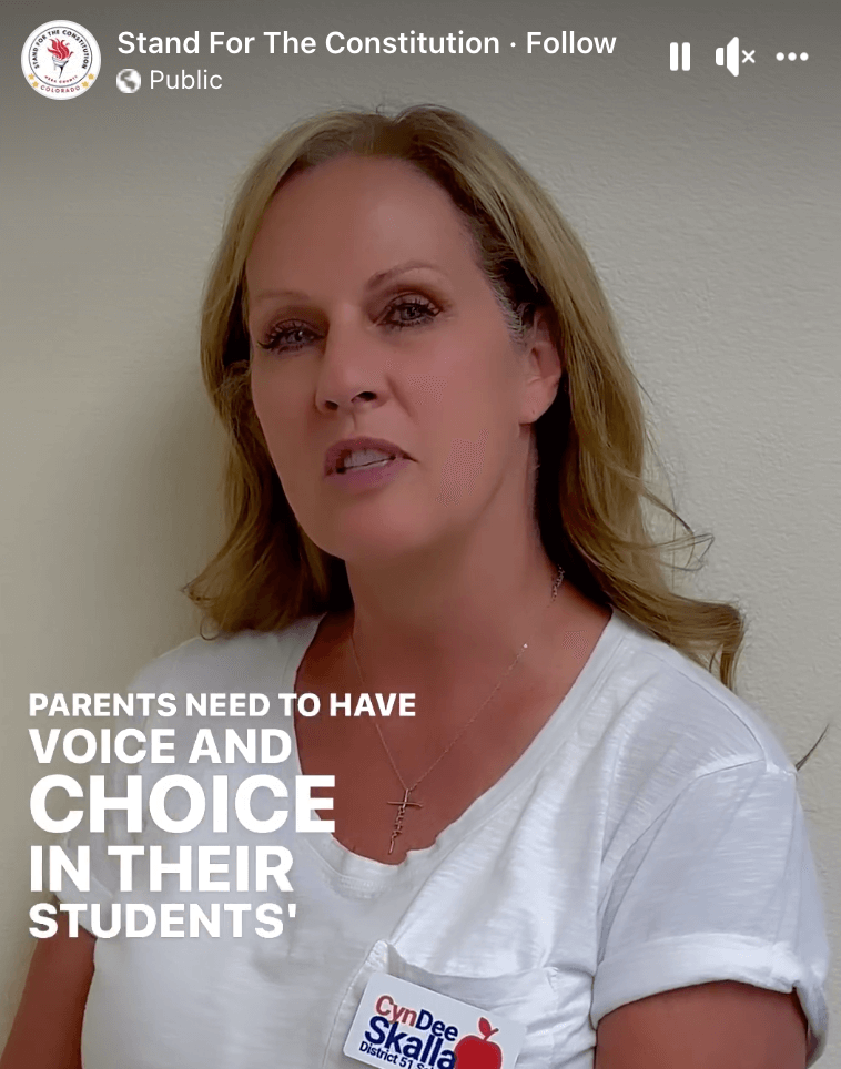 CynDee Skalla appealed to the far right extremist group Stand for the Constitution for votes for school board in this Sept. 25, 2023 video posted on the group’s Facebook page.