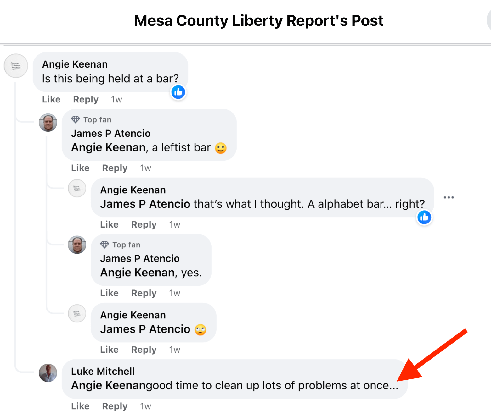 The threat was in the form of a comment written by Luke Mitchell under a “Mesa County Liberty Report” post announcing the forum. The “Liberty Report” page is favored by local conservatives and hosted by an unnamed person who describes himself as a “media personality.” The site description says it gives readers “a perspective that local corporate media won’t give you in Mesa County,” yet it posts news articles from the Grand Junction Daily Sentinel, KREX-TV, the New York Times, CNBC and other corporate media outlets.