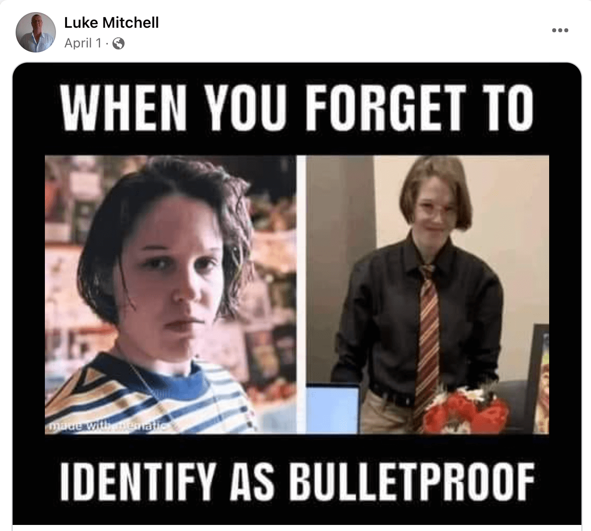 2. Go to the FB page — report Luke Mitchell [the person who made the comment] to FB for Violence. Maybe he’ll be put in FB timeout for a while. Maybe not, but it’s the least that you can do