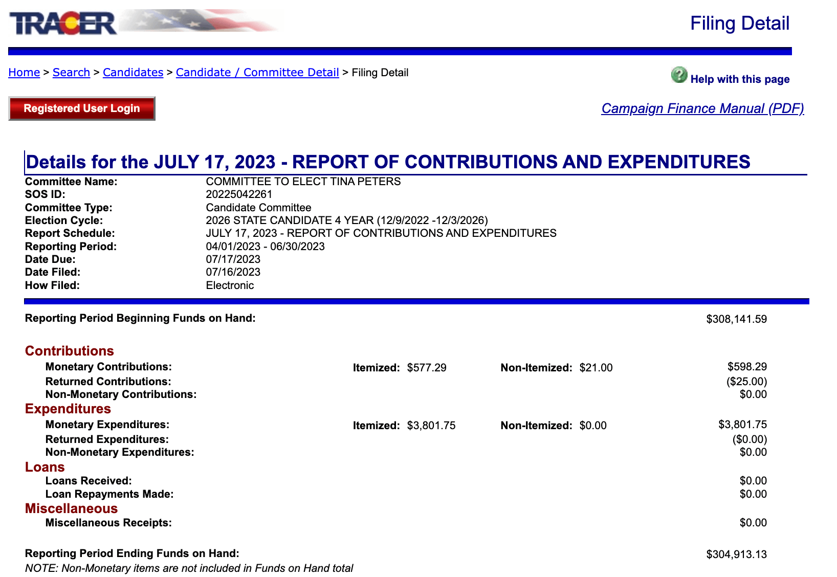 Indicted former Mesa County Clerk Tina Peters has filed to run for Secretary of State in Colorado in 2026, and as of July 23, 2023 had almost $305,000 in the bank for her campaign, according to Colorado Tracer, the online campaign finance reporting system.