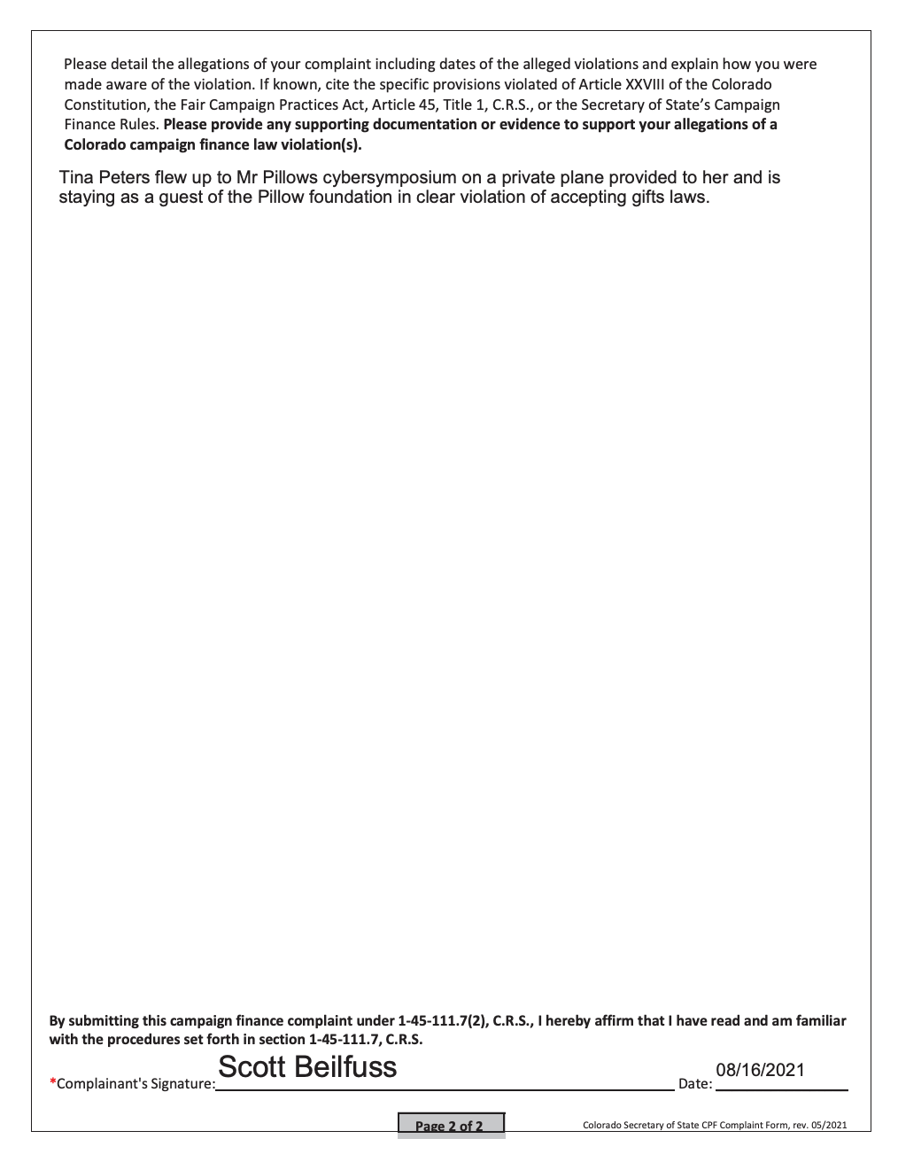 “Tina Peters flew up to Mr. Pillows cybersymposium on a private plane provided to her and is staying as a guest of the Pillow foundation in a clear violation of accepting gift laws.”