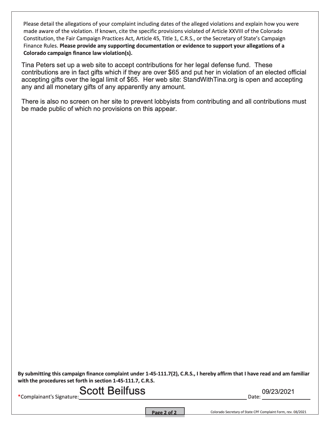 The fine was the end result of two campaign finance complaints filed in 2021 by Scott Beilfuss, who is now a Grand Junction City Councilman. The first complaint was dated August 16, 2021. Beilfuss wrote a single sentence: