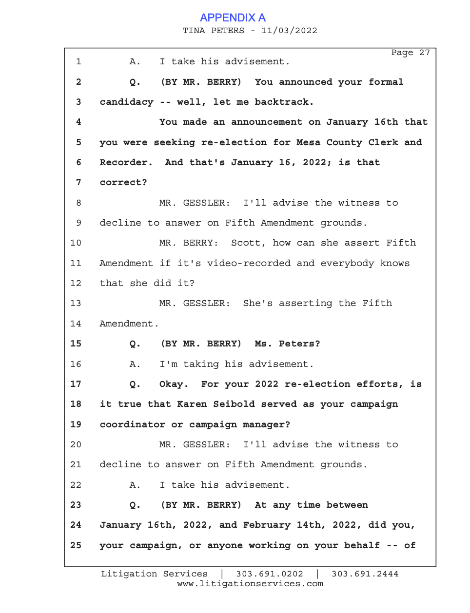 She was deposed by Assistant Attorney General Josh Barry on November, 3, 2022, in Grand Junction, accompanied by her attorney, Scott Gessler. Here are some excerpts from the deposition: