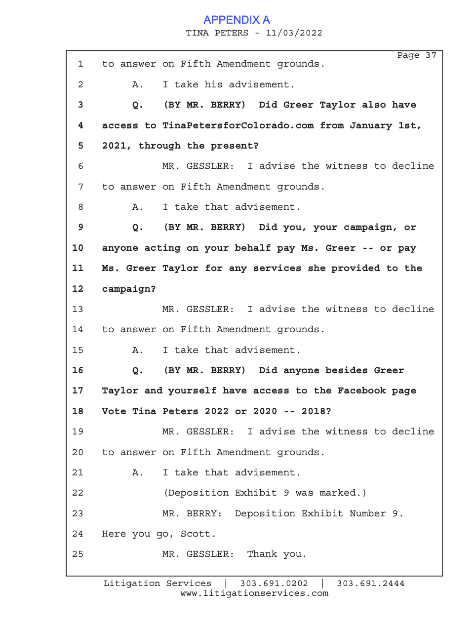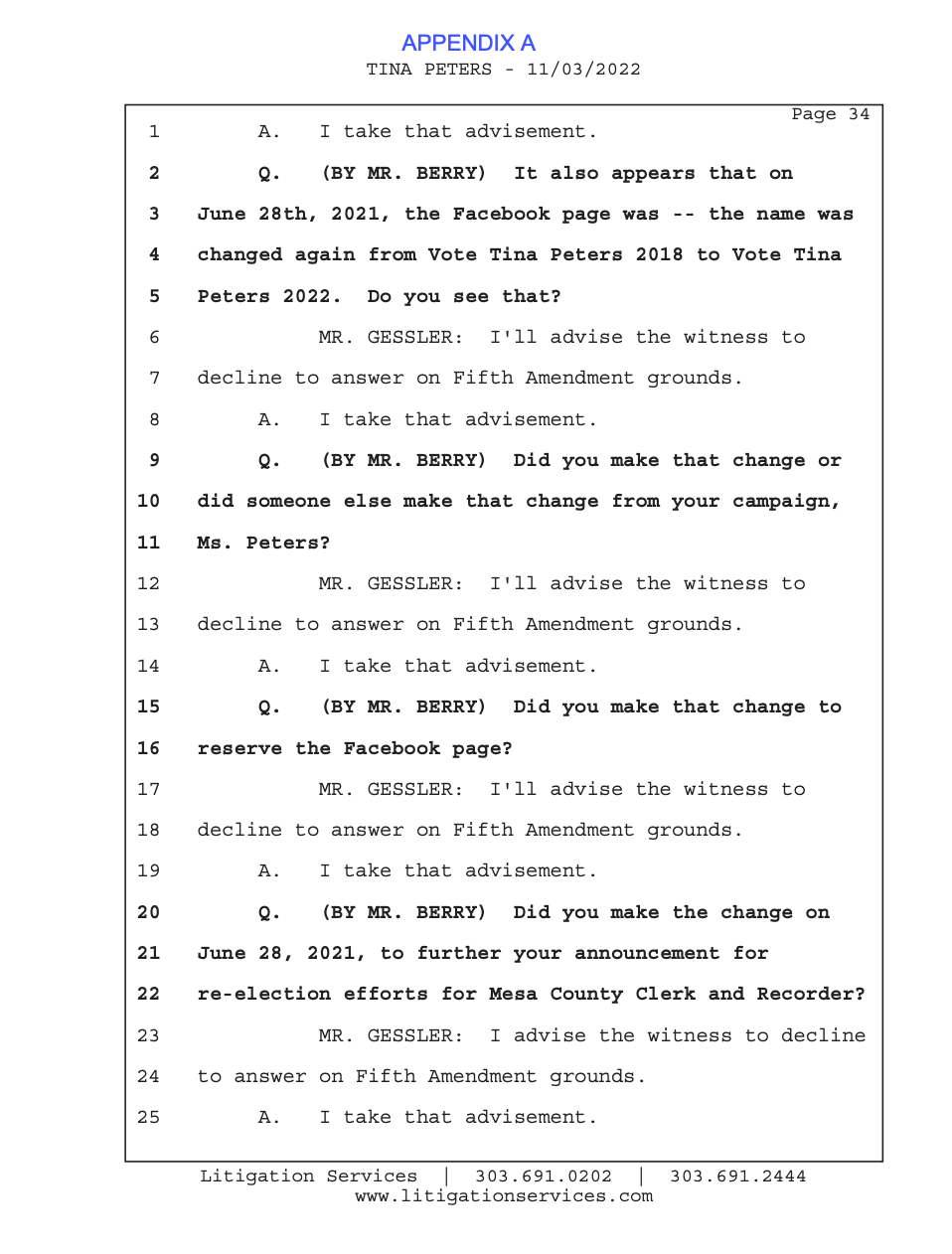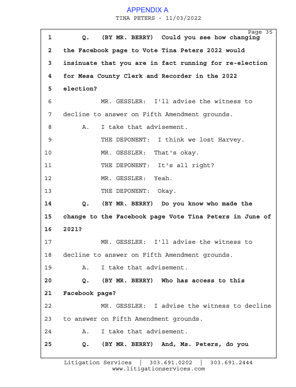 Perhaps the most interesting part of this whole matter arose when attorneys for the State deposed Peters in the case. Peters asserted her 5th Amendment right to remain silent to avoid incriminating herself in response to question after question after question throughout the deposition. Excerpts from the deposition were included in a 30-page post-hearing statement by the Attorney General’s office. (It’s available online as the document dated 3/3/23, at this link). The post-hearing statement shows that in a sample 17 pages of the deposition, Tina Peters took the 5th Amendment against self-incrimination 43 times.
