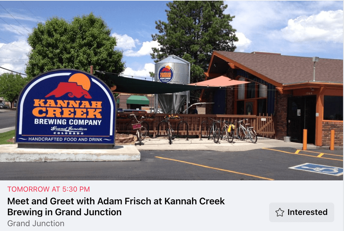 Adam is hosting a Meet-and-Greet Wednesday, 2/28 from 5:30-6:30 p.m. at Kannah Creek Brewing Company, 1960 N. 12th St., Grand Junction. Adam advocates a climb-down from the “angertainment” politics we’ve had to endure in CD-3 for the last few years