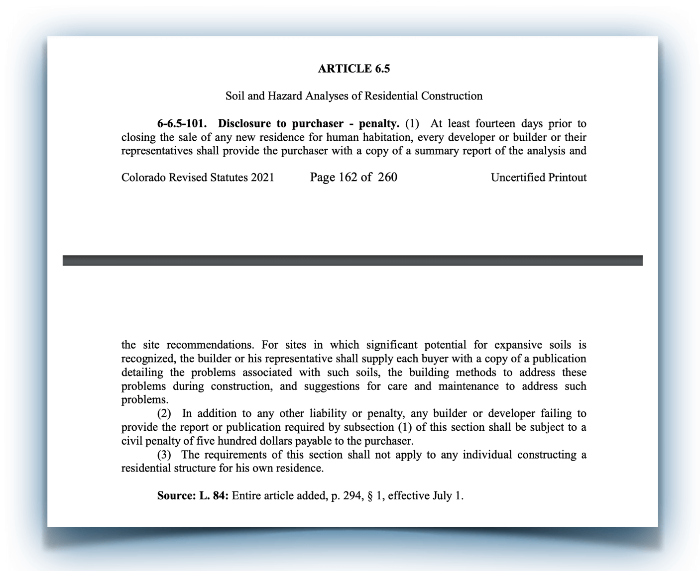 Colorado law requires builders to disclose any evidence of swelling soils present at a building site to potential home buyers: