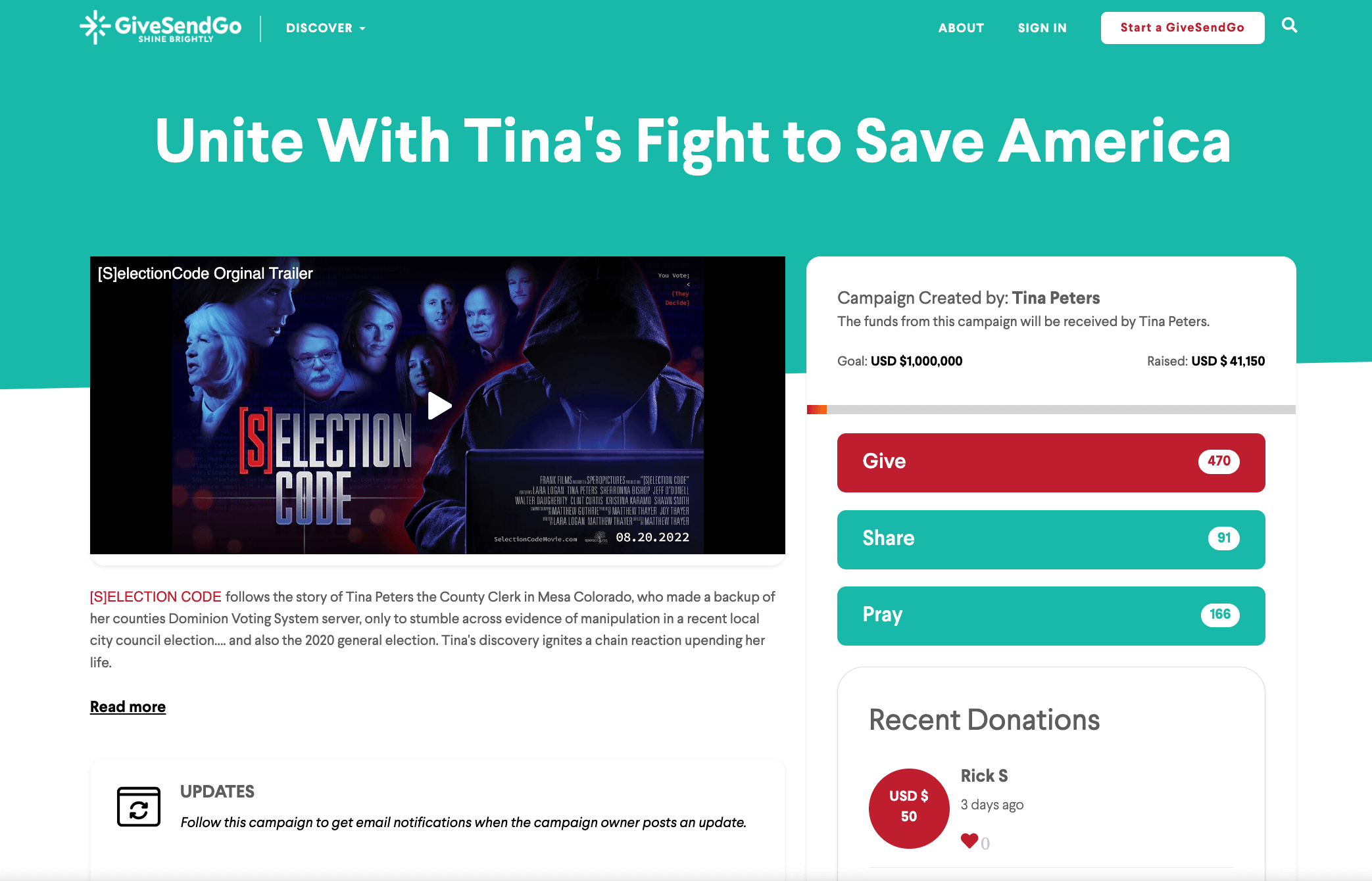 In addition to her legal defense fund, Tina also has a fundraiser on the religious site GiveSendGo, raising money for her personal maintenance, with over $40,000 raised so far and a stated fundraising goal of $1 million.