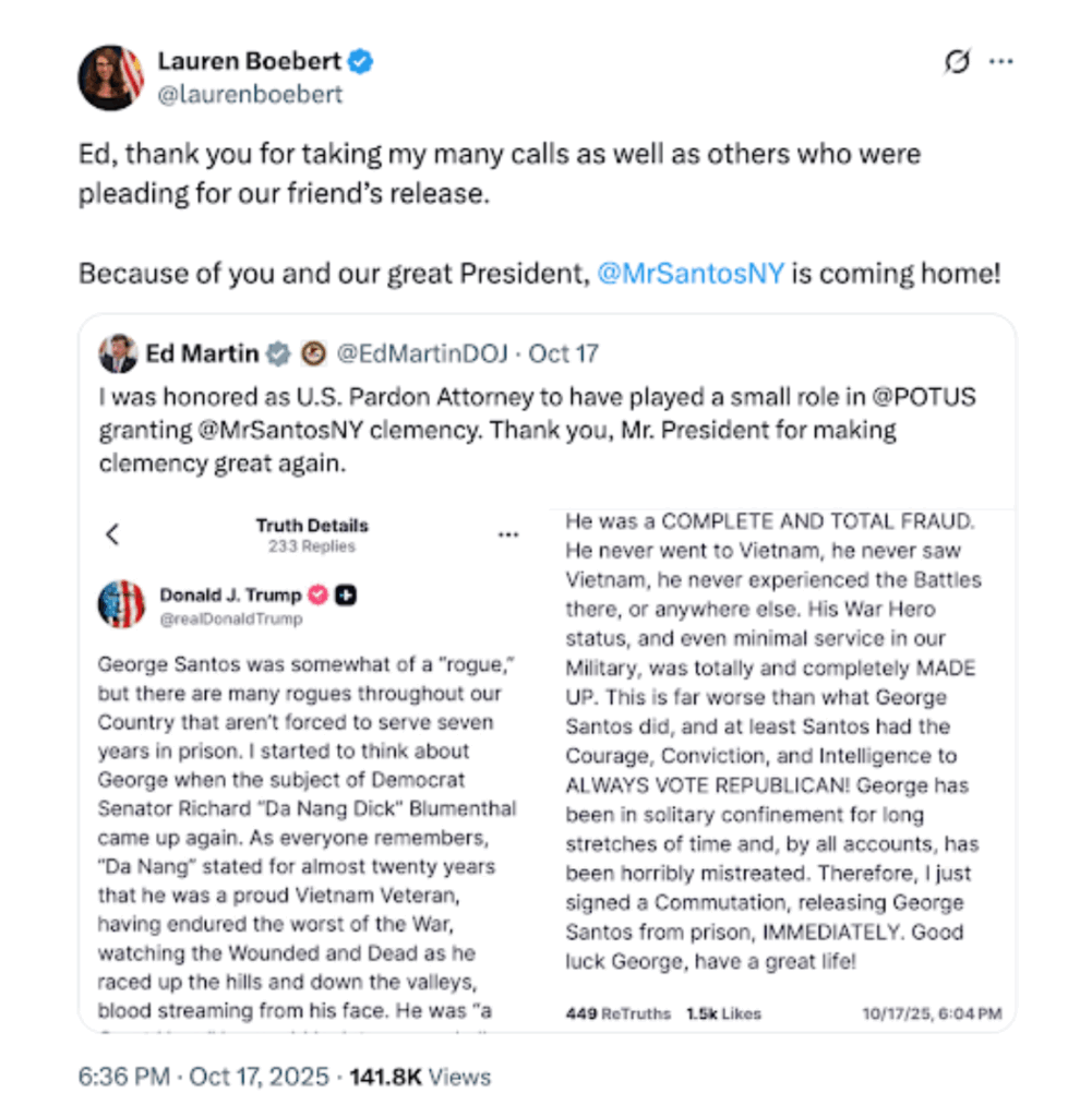 After his lies and frauds were discovered, Santos plead guilty in 2024 and was sentenced to over seven years in prison. He served less than three months of his sentence when convicted felon/sexual abuser/President Trump commuted his sentence, springing Santos from prison, relieving him of probation and having to pay any fines or restitution to any of his victims.