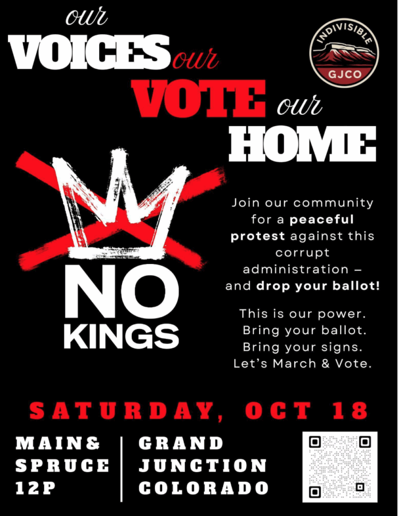 Come ready to march! Park early, bring water & positive energy, and listen to Organizers & Peace Team. (Those not marching can stay at Main & Spruce). Our last No Kings event saw 3,500 people in GJ and millions nationwide. Let’s blow that number away – spread the word & bring friends!