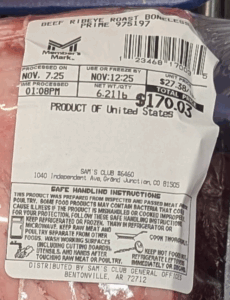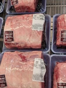 Other markets are offering slightly better deals. Safeway is charging $17.99/lb. for rib roasts. City Market has not yet advertised their holiday prime rib roasts but bone-in ribeye steaks there are currently selling for $20.99/lb. WalMart is selling rib roasts for $14.87/lb., but some online reviewers who ordered rib roasts from WalMart this year said the meat they got was too fatty or tough to eat, and/or was beyond its use-by date and had a stale odor. Some of the people leaving bad reviews documented their complaints with photos of the meat they got.