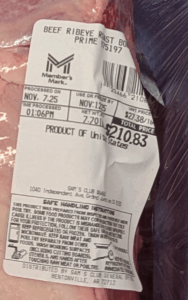 The per-pound price of house brand beef ribeye roasts at Sam’s Club on 11/9/25