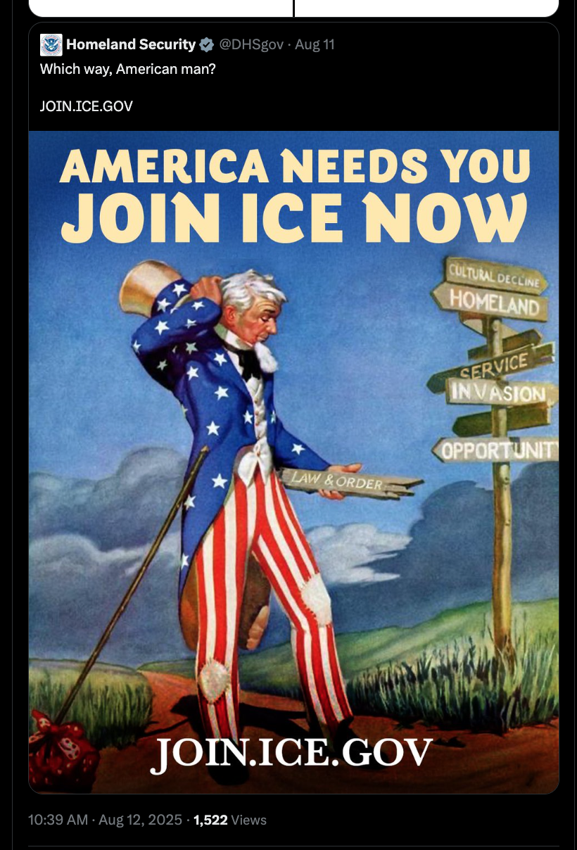 The idea is to counter to Department of Homeland Security (DHS) Secretary Kristi Noem’s aggressive national recruitment commercials (pdf) and promised incentives like $50,000 cash bonuses at signing, student loan forgiveness, a minimum age of 18 and overtime pay. A recent Department of Homeland Security post on Twitter/X shows a drawing of Uncle Sam at a crossroads sign and featuring the caption “Which way, American Man?,” apparently in reference to a 1978 white nationalist book of that name by William Gayley Simpson that was published by the National Alliance, a neo-Nazi hate group: