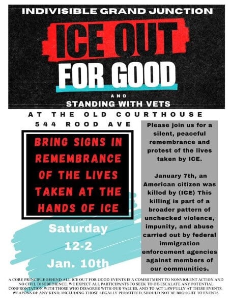 Community members and advocates will gather on Saturday, January 10, 2026, from 12:00–2:00 PM at the Old Courthouse, 544 Rood Avenue, Grand Junction, Colorado, for an ICE Out for Good rally to mourn lives lost, demand accountability, and call for an end to Immigration and Customs Enforcement (ICE) and Customs and Border Protection (CBP) raids.