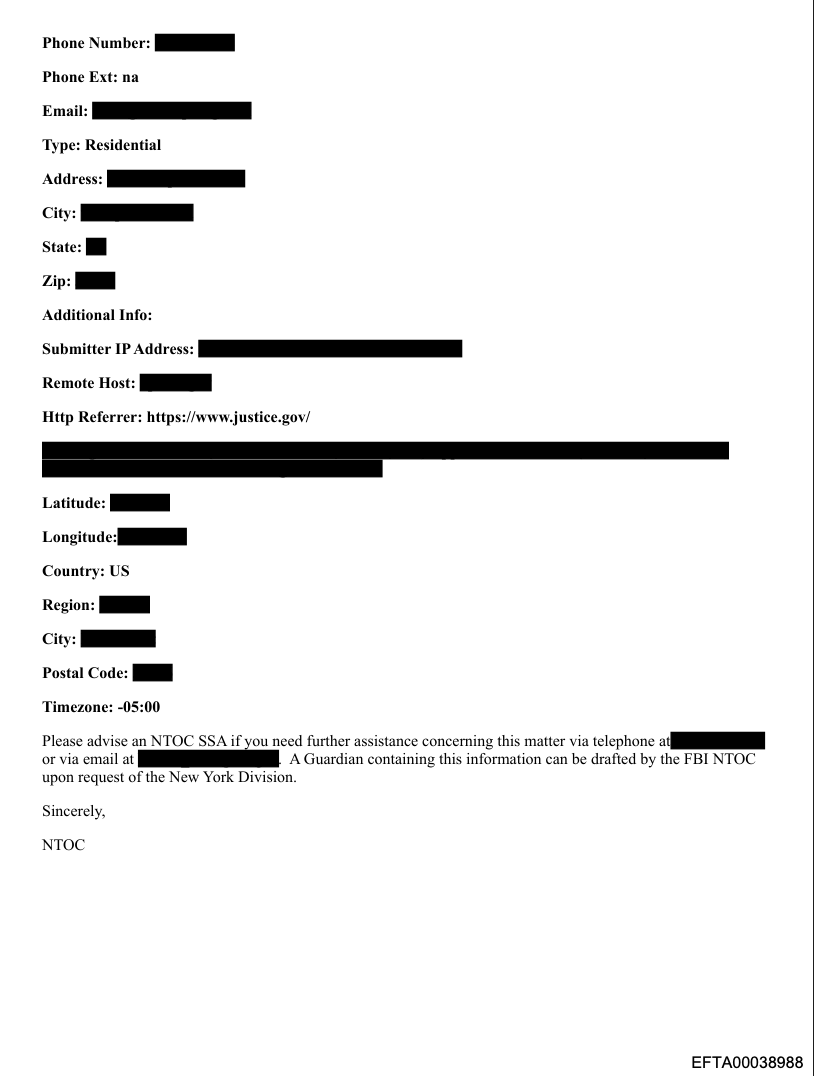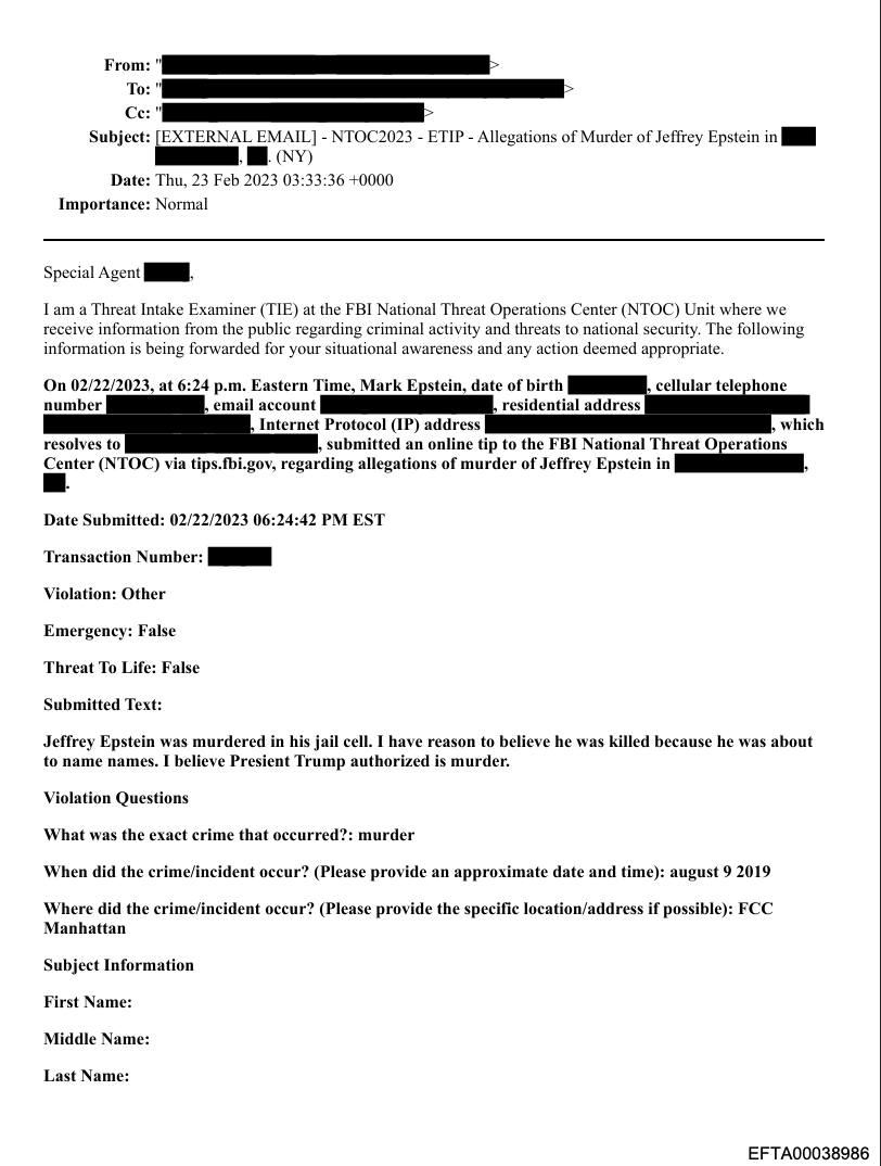This email from the Epstein files, Bates No. EFTA00038986, is about a tip sent to the FBI’s National Threat Operations Center (NTOC) tip website by Jeffrey Epstein’s brother, Mark Epstein, on 2/22/2023.