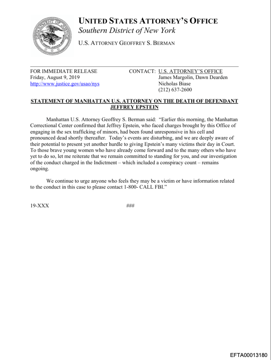 the document below, (Bates No. EFTA00013180), is a draft statement from the Manhattan U.S. Attorney about the death of Jeffrey Epstein dated August 9, 2019 — the day before Epstein was found dead in his jail cell: