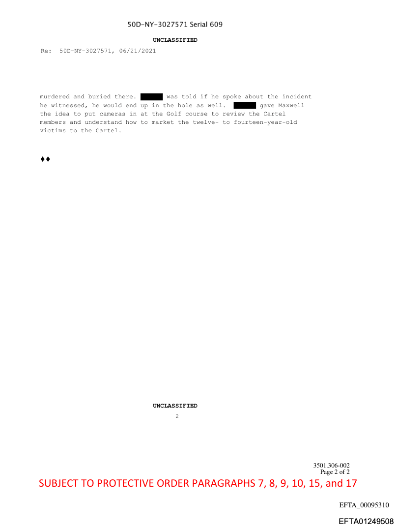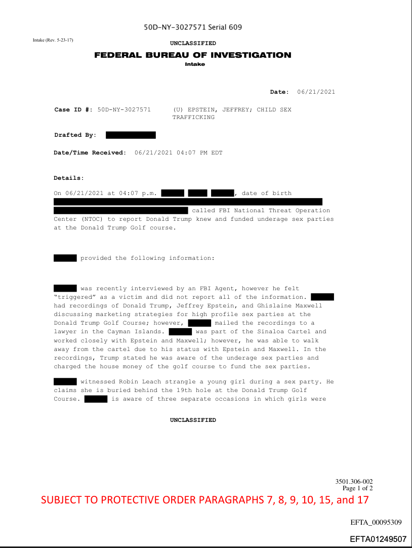 The document below (ID #EFTA01249507, pdf) reveals that a male who identified himself as a victim in the Epstein case called the FBI’s National Threat Operations Center (NTOC) on the afternoon of June 21, 2021 to report that “Donald Trump knew and funded underage sex parties at the Donald Trump Golf course.” The caller said he had recordings “of Donald Trump, Jeffrey Epstein, and Ghislaine Maxwell discussing marketing strategies for high profile sex parties at the Donald Trump Golf Course,” although the specific Trump golf course is not named. The person also states “[name blacked out, presumably the person reporting the crimes] “witnessed Robin Leach strangle a young girl during a sex party. The FBI employee who took the call wrote, “He claims she is buried behind the 19th hole at the Donald Trump Golf Course.” (Interestingly, Trump’s first wife, Ivana Trump, is buried at the Trump National Golf Club in Bedminster, New Jersey, in a plot located near the first tee of the golf course. Trump’s Bedminster golf course has a 10-plot cemetery. New Jersey tax code exempts all cemetery land from taxes.)