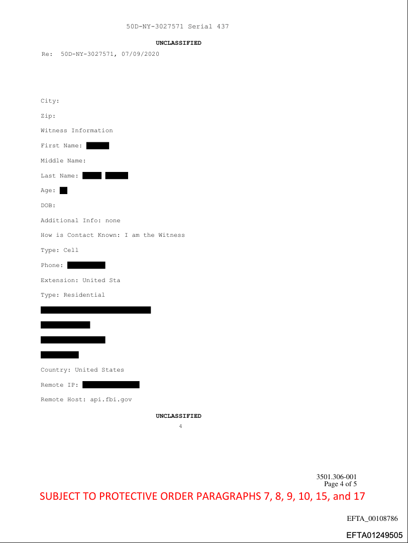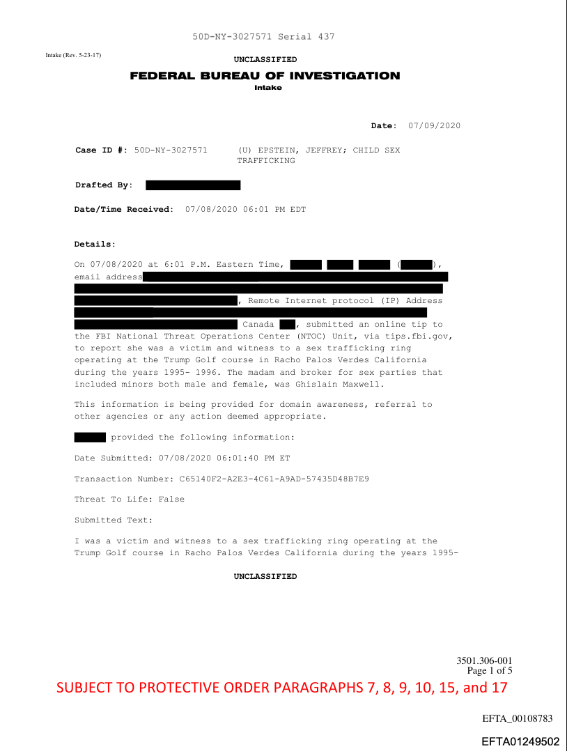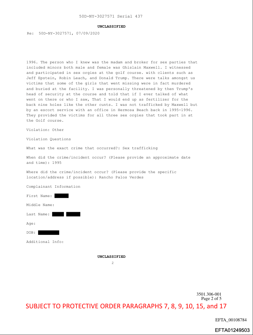 Another NTOC report (document No. EFTA01249502, pdf), reveals that a female called the NTOC on July 8, 2020, to report she was also an Epstein victim and witnessed a sex trafficking ring operating out of the Trump Golf course in Rancho Palos Verdes, California, during the years of 1995-1996. The person reported that “the madam and broker for the sex parties, that included minors, both male and female, was Ghislaine Maxwell.” The caller said, “I witnessed and participated in sex orgies at the golf course.”: