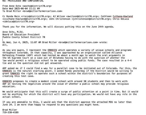 The complaint alleges Miller tacitly offered Ochs a lucrative, six-figure employment contract (pdf) with ERBOCES that included health, dental, vision, life and disability insurance, a $500 monthly travel stipend, $100/month cell phone benefit and more, in exchange for Ochs fast-tracking a Memorandum of Understanding (MOU) to create the “Riverstone Academy,” a publicly-funded K-5 elementary school with a “Christian foundation.” The controversial school was billed as the first publicly-funded Christian school in Colorado, which would be illegal under Colorado’s Constitution: