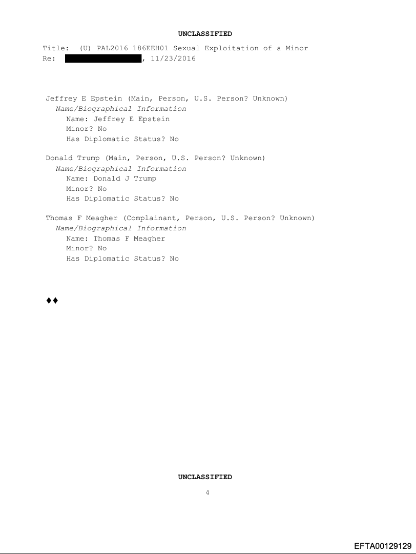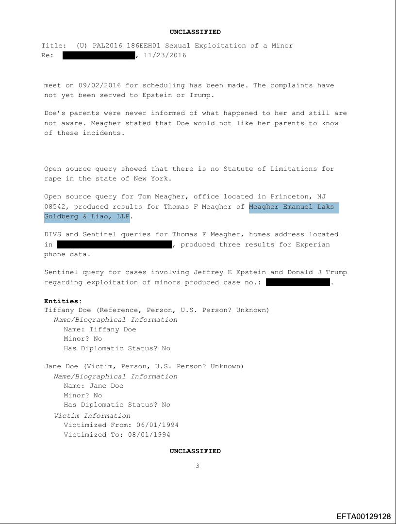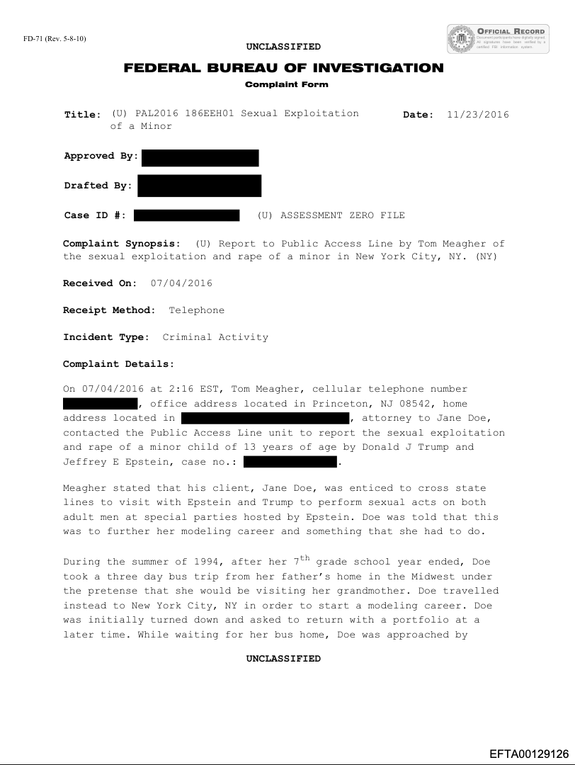 A complaint phoned into to FBI in the Epstein files (identifier Bates No. EFTA00129126)(pdf) dated 11/23/2016 memorializes a call made to the FBI’s Public Access line on July 4, 2016 from a Princeton, New Jersey attorney named Thomas Meagher to report “the sexual exploitation and rape of a minor in New York City, NY.” The document states the attorney “contacted the Public Access Line unit to report the sexual exploitation and rape of a minor child of 13 years of age by Donald J. Trump and Jeffrey E. Epstein, case no. [REDACTED].” The assaults allegedly occurred between June 1, 1994 and August 1, 1994.