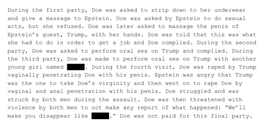 Another interesting fact about this complaint (and Doe’s 2016 lawsuit) is that it states there was a witness to all four instances of sexual assault on Jane Doe at parties involving Trump and Epstein. The witness, identified as “Tiffany Doe,” said she was employed by Epstein and that her “job was to recruit young girls to attend Epstein’s parties with the knowledge they would be coerced into sexual activities.” The complaint states “Tiffany was regretful of what happened to Doe.”