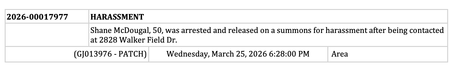 McDougal was subsequently arrested (pdf) and charged with harassment: