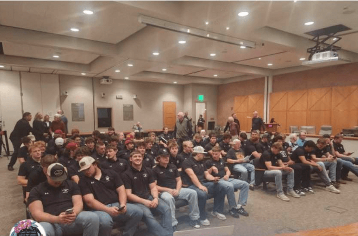 The CMU football team was fed plenty of pizza before the March 4 City Council meeting, after which they all duly testified in favor of the lease to give exclusive use of the publicly-owned Lincoln Park Barn to the CMU football team for the next 25 years. (Photo: JG, Facebook)At the Grand Junction City Council meeting last Wednesday, March 4, (video) Council members voted 5-1 in favor of the City signing a lease handing Colorado Mesa University (CMU) exclusive use of the Lincoln Park Barn. The lone vote cast against signing the lease was At-Large City Council member Scott Bielfuss. Council member Robert Ballard (District E) was absent.