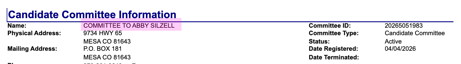 The forms say in several places that her candidate committee’s name is “Committee to Abby Silzell,” not what we would normally expect, “Committee to Elect Abby Silzell.” Silzell submitted the information on her candidacy, which apparently contains this error, to the state on 4/4/26 and so far it has not been corrected.