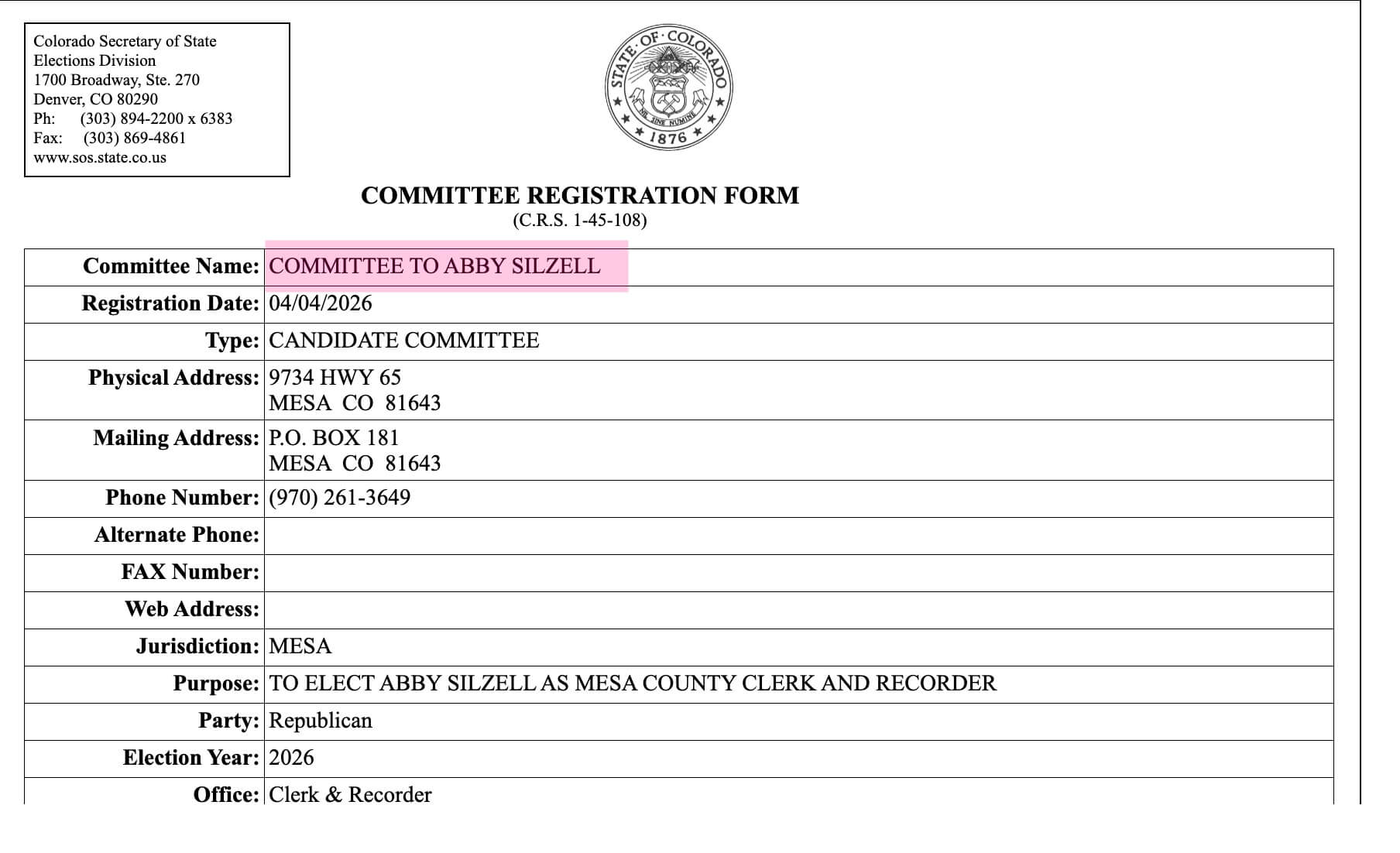 What you’re seeing in the above screenshots is how Ms. Silzwell registered her candidacy with the Colorado Secretary of State.
