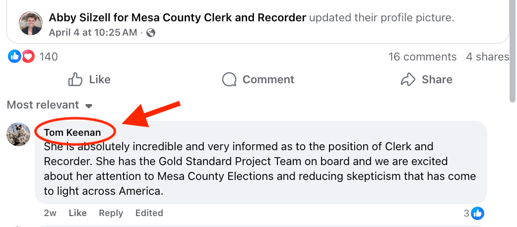 This is important because Keenan is a local conservative political activist who has been an election denier since 2021. He is also former candidate for Mesa County School Board who doesn’t believe students should pursue higher education and who was unable to put together a coherent sentence in a candidate questionnaire for that position in 2017. Keenan is a regular attendee at local political meetings that have featured, supported and defended former Mesa County Clerk — and now convicted felon doing 9 years in prison — Tina Peters, like meetings held by the extremist right wing group Stand for the Constitution.