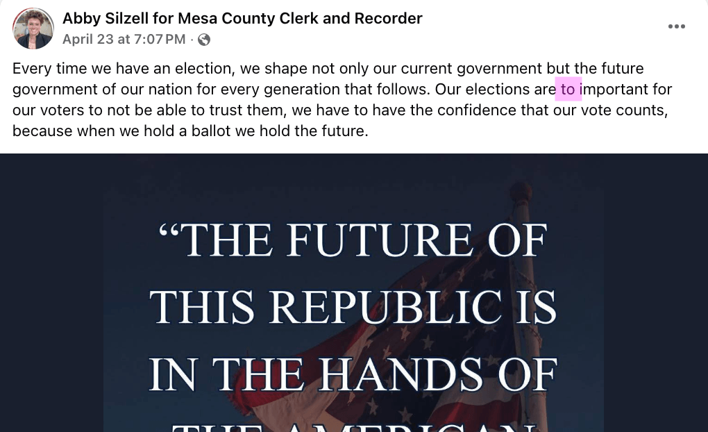 Silzell’s social media posts also contain spelling and grammatical errors, albeit minor ones. Here is one from her candidate Facebook page made on April 27: