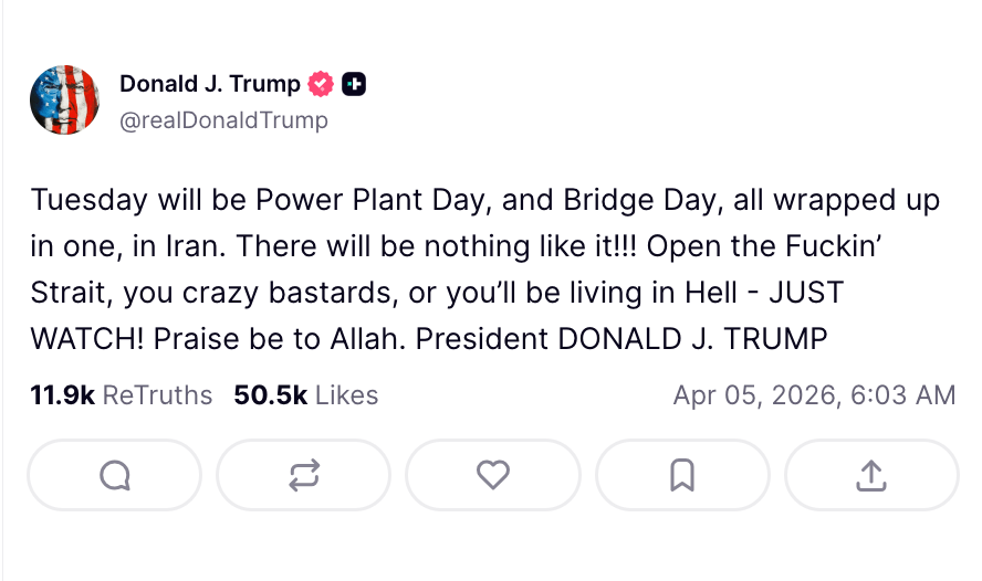 Donald Trump posted the above message on Easter Sunday, April 5, 2026.