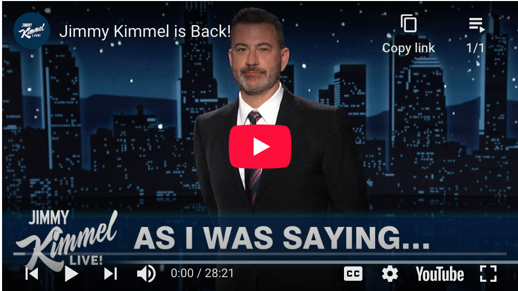 Jimmy Kimmel’s full monologue upon his show’s return after the Trump regime threatened to regulate freedom of speech